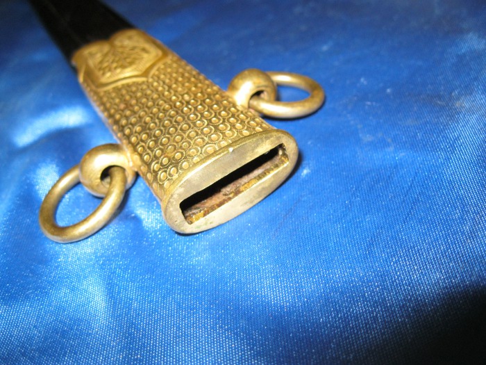 Dieses Stück wurde nicht in der üblichen "Seitengewehrtragetasche" geführt. Das Mundblech weist zwei seperate Trageringe auf und wurde demzufolge an zwei kleinen Lederriemen mit Messingkarabinerhaken getragen.