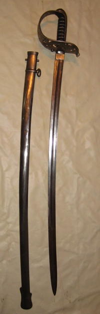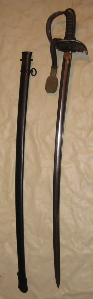 Koml. mit angeschraubter Fingerschlaufe, Stoßleder und Portepee. Rückenklinge mit beidseitiger Hohlbahn zum Stichblatt hin durch sogenannte "Kapsel" zusätzlich fixiert. Hersteller "Gebr. Weyersberg Solingen". Brünierte Stahlblechscheide.