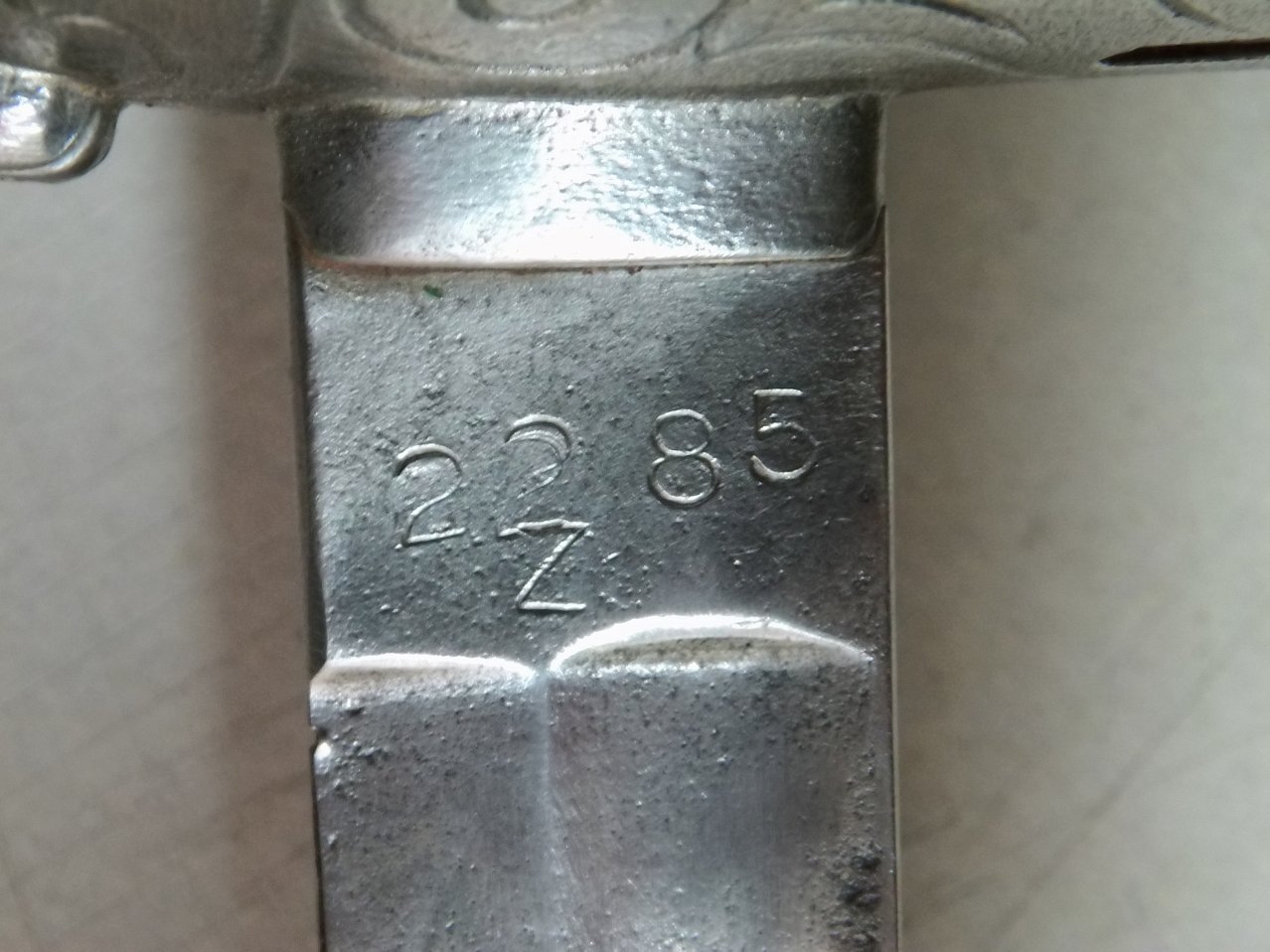 Interessant sind die Sichtungsnummern auf der Fehlschärfe „22 85 Z“. Es könnte sich hierbei um die 1922 erfolgte Registrierung von Blankwaffen außerhalb des Militärs handeln. Also Polizeiwehr, Schutzpolizei, Landjäger Kommunalpolizei, Zoll etc. Demnach die registrierte Waffe Nr. 85. Die Erklärung des „Z“ bleibt spekulativ: Zoll, Zeughaus oder auch eine Kommune, bei der der Name mit Z beginnt. Wobei gerade in der Nachkriegszeit der Säbel nicht zwangsläufig im Freistaat Württemberg gelandet sein muß.