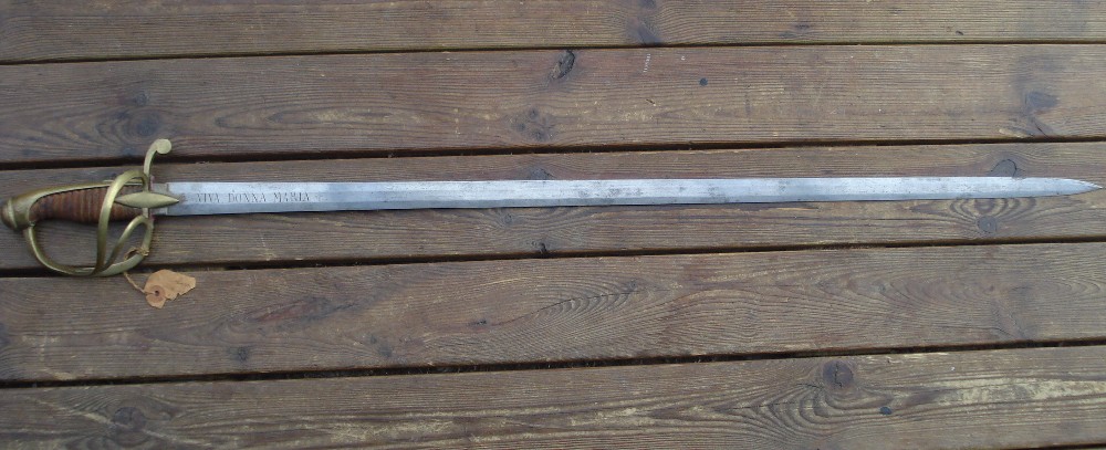 I just got this Pallasch and I dont know where its from. Total length is 103 cm, klingenlänge 89 cm. Straight blade with double edge. "Viva Donna Maria" on both sides and a small flowerlike symbol.