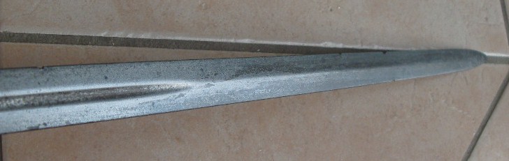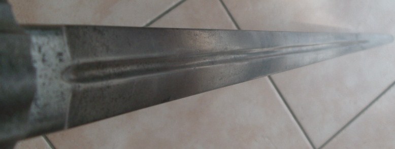 Zweischneidige Klinge, beidseitige Kehlung, diese endet ca. 250 mm vor dem Klingenort.