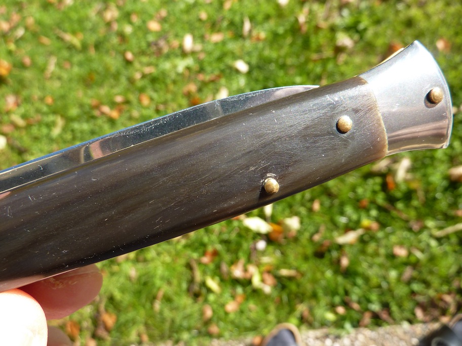 hier kommen nun "sonnige" Bilder. Habe zum Vergleich die Horngriffschalen eines anderen Messers gleich mitfotografiert, und bei Licht betrachtet scheinen das doch Holzgriffschalen beim Weidmesser zu sein. Was meint ihr?