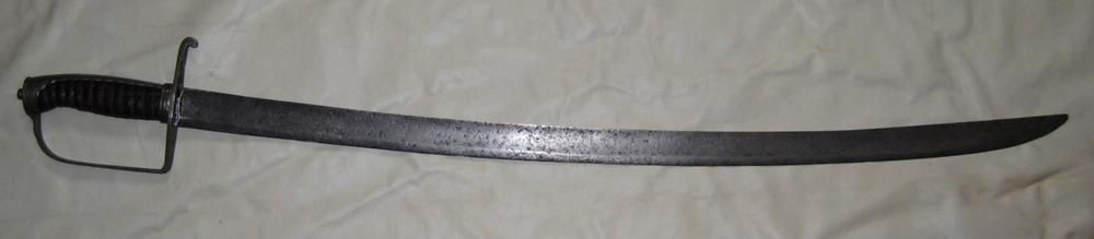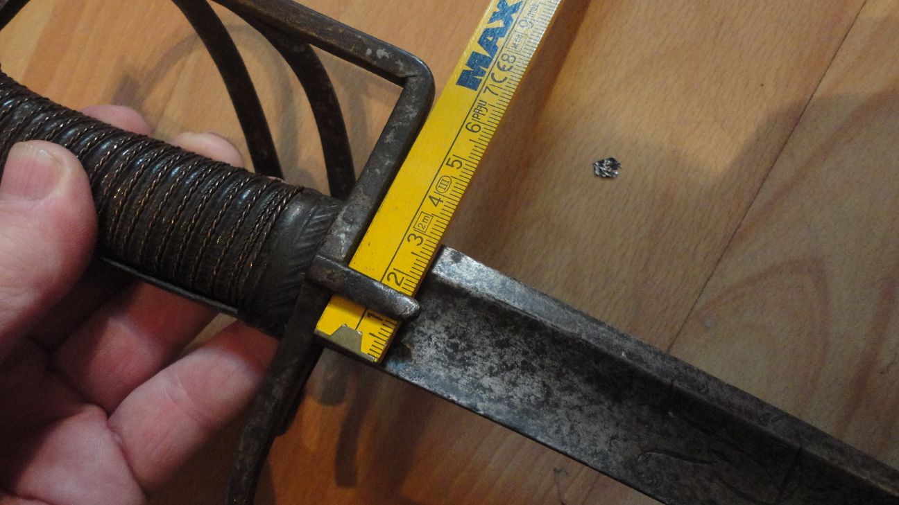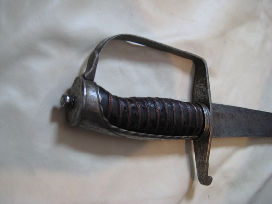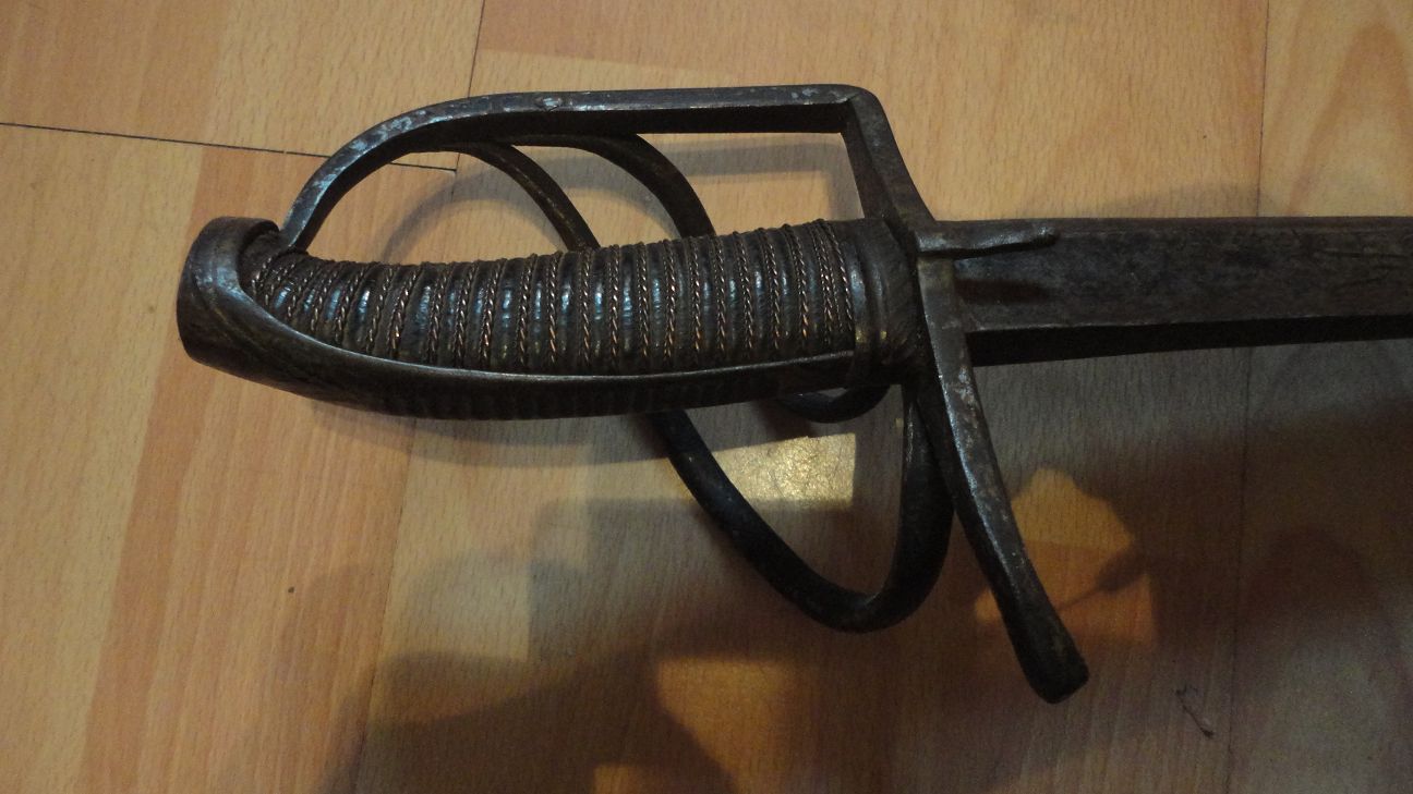 Eisernes Griffbügelgefäß, hölzerne Griffhilze mit Leder überzogen und Kupferdrahtwicklung. Eiserne Griffkappe. Es befinden sich Reste an Gravuren auf der Terzseite der Klinge ein gekröntes "F II" (für Friedrich II reg. 1797 - 1816). Auf der Quartseite eine Krone und das kurfürstliche Wappen mit den drei Hirschgeweihstangen.