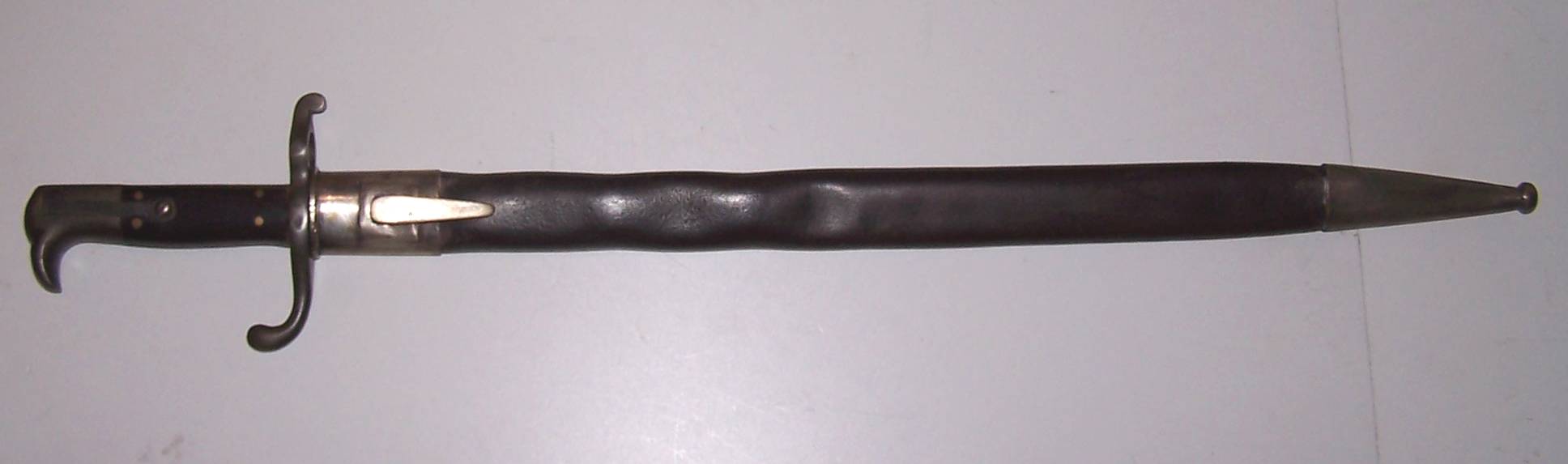 Geschwärzte Lederscheide mit vernickelten Beschlägen,