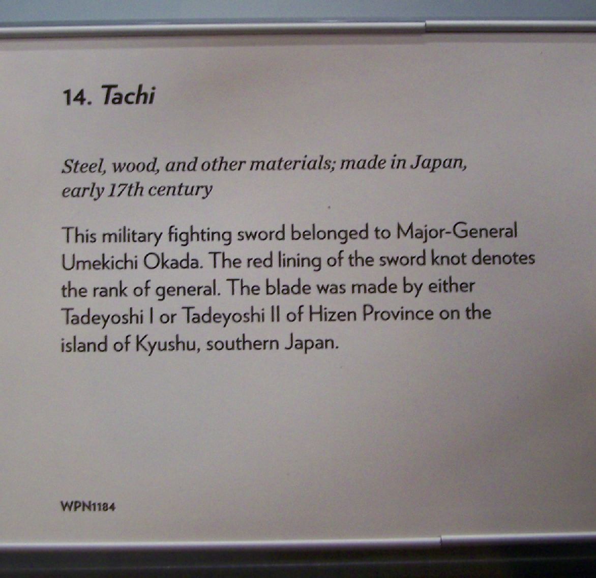 Im National Maritime Museum Greenwich / London entdeckte ich im letzten Raum des Ausstellungsbereiches „Händler: Die Ost-Indien Gesellschaft und Asien“ in einer Vitrine das Shin Gunto des Generalmajors OKADA Umekichi (1891 – 1967). Okada leitete 1945 als Kommandeur die Verteidigung von Hong Kong. Am 16. September unterzeichnete er die Kapitulation und übergab sein Schwert an den britischen Marineoffizier Sir Cecil Harcourt.