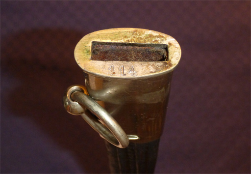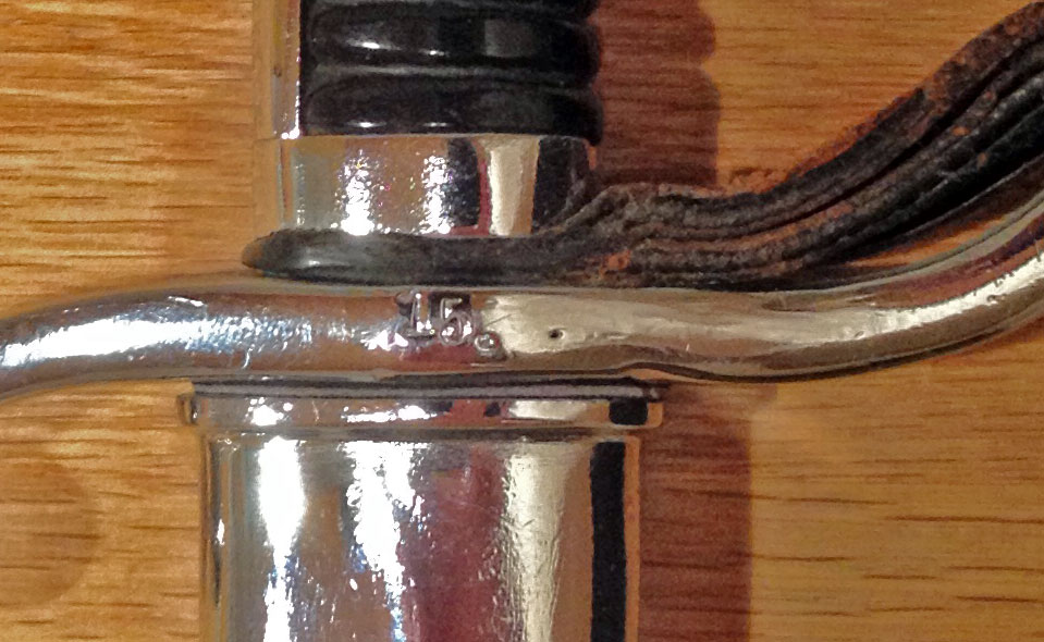 Interessant war für mich die Stempelung. Sowohl die Waffe (wenn auch recht lieblos) als auch das Mundblech der Scheide sind mit der Nummer 114 gestempelt. Auf der Parierstange finden sich ein Geweih und ein P. . Wer kann mir mit der Stempelung helfen? War es üblich Polizeiwaffen mit einer laufenden Kammernummer zu versehen? Ist es tatsächlich so einfach und das P. bedeutet Polizei?
