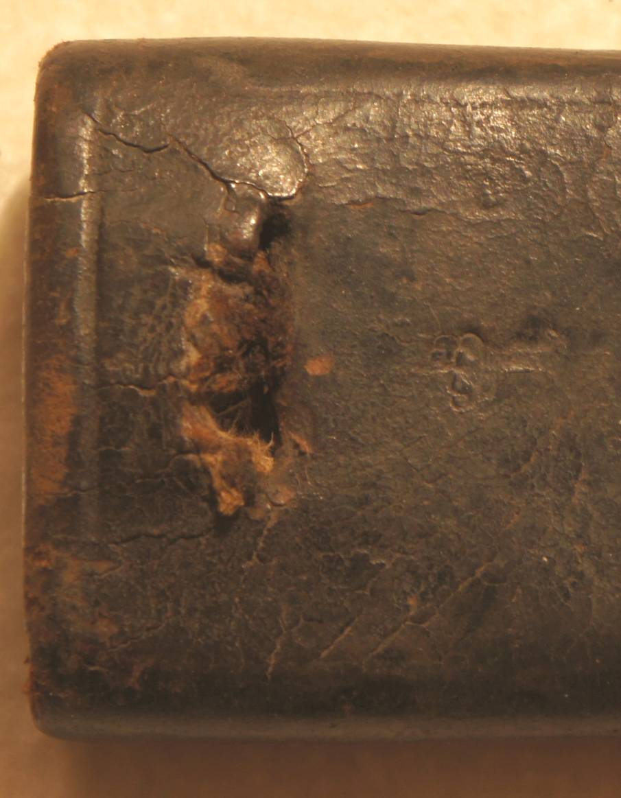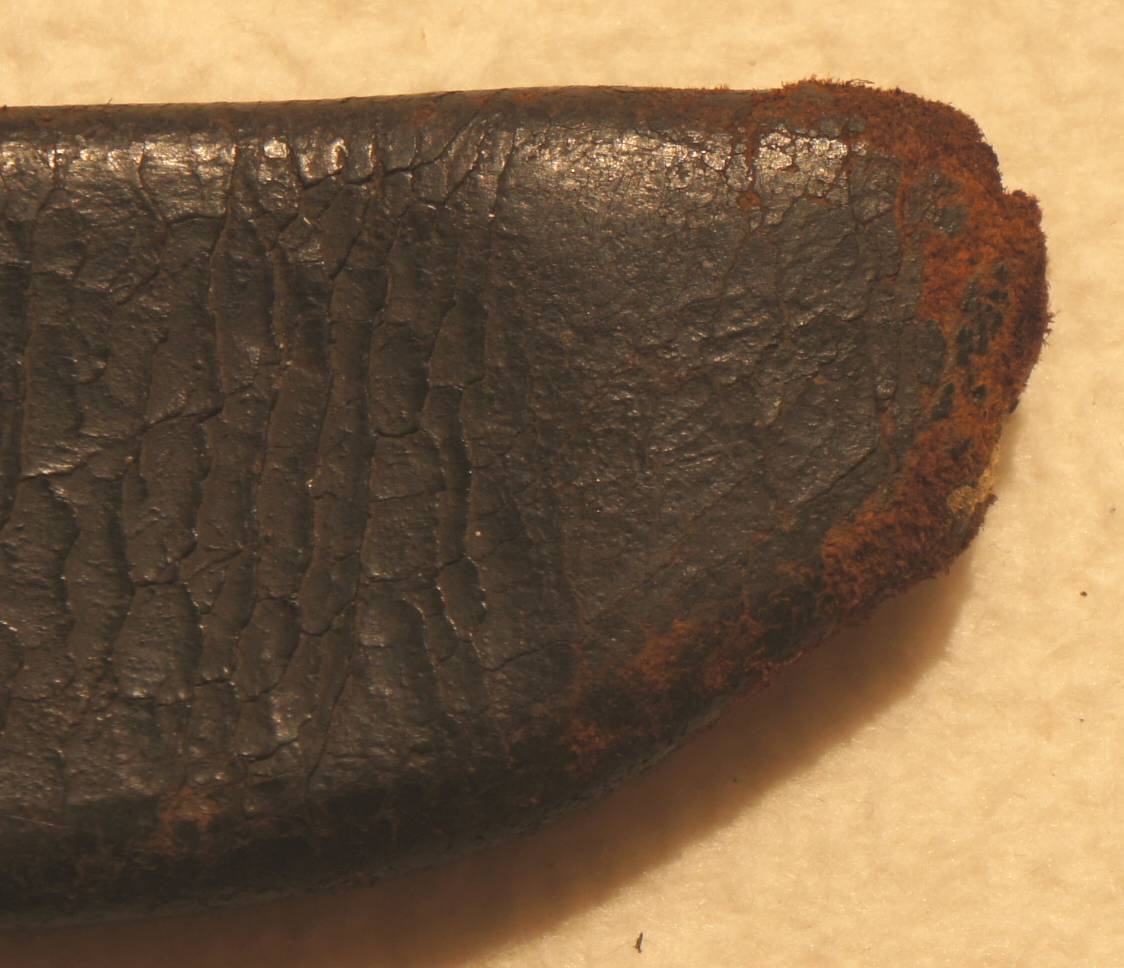 Schwarze Lederscheide ohne Beschläge, im Bereich des Leder-Mundstückes