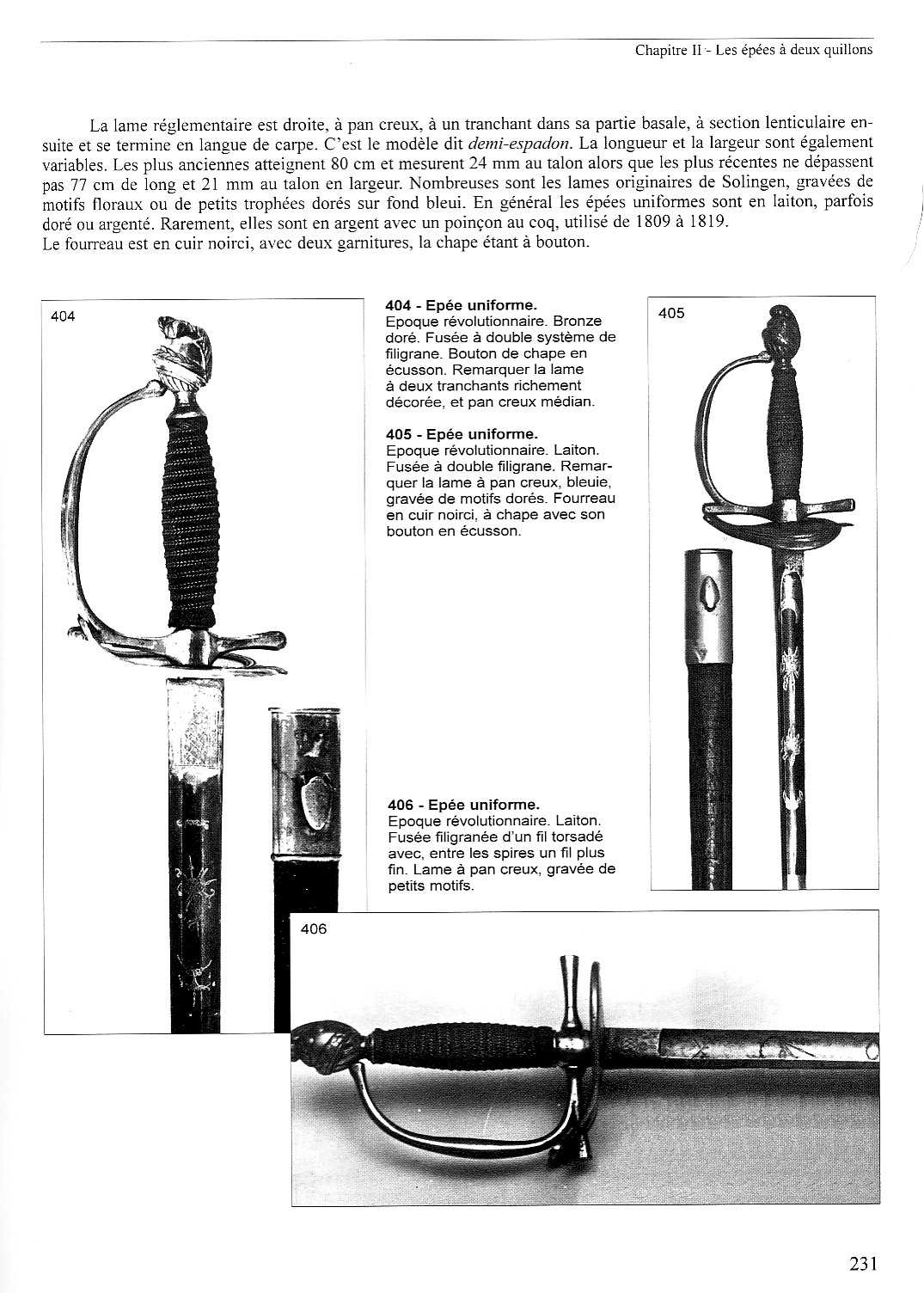 Um das Alter dieser Degen einzuordnen, dient das Stichblatt. Offiziell wurden diese "èpées uniformes" von 1787 - 1789 geführt, sie blieben aber bis 1816 in Gebrauch. Bei den älteren Exemplaren sind die Stichblätter symmetrisch und messen 112 x 88 mm. Später wurde das Stichblatt verkleinert auf 107 x 88 mm. Bei jüngeren Stücken war das Stichblatt asymmetrisch, d.h. auf der Quartseite schmäler (Abmessungen: 107 x 68 und noch später 107 x 64 mm).