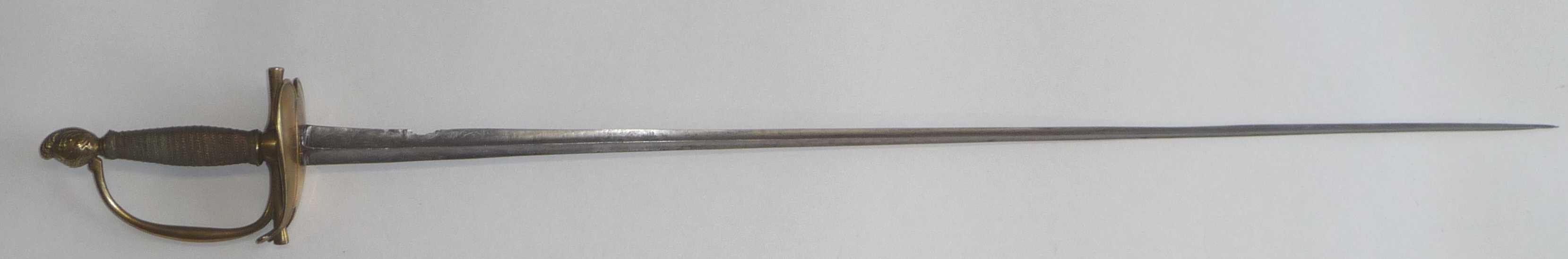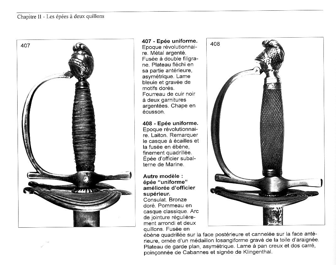 Um das Alter dieser Degen einzuordnen, dient das Stichblatt. Offiziell wurden diese "èpées uniformes" von 1787 - 1789 geführt, sie blieben aber bis 1816 in Gebrauch. Bei den älteren Exemplaren sind die Stichblätter symmetrisch und messen 112 x 88 mm. Später wurde das Stichblatt verkleinert auf 107 x 88 mm. Bei jüngeren Stücken war das Stichblatt asymmetrisch, d.h. auf der Quartseite schmäler (Abmessungen: 107 x 68 und noch später 107 x 64 mm).