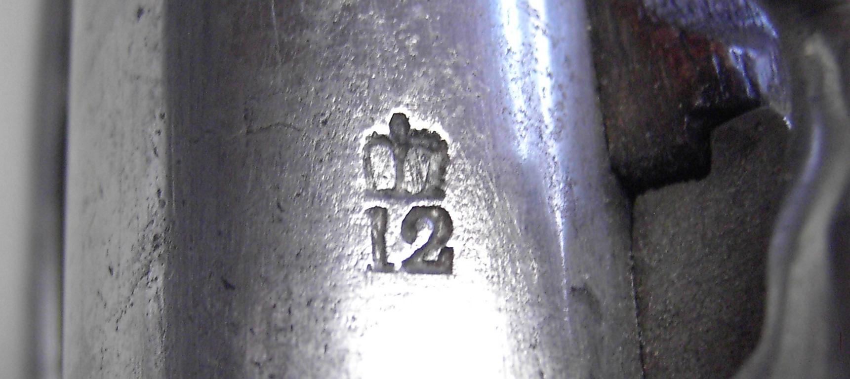 „GR“ mit Broad Arrow unter Krone und Tower-Abnahmestempel „gekreuzte Schwerter unter Krone“ sowie „