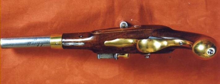 Nussbaum-Halbschaft mit Messingbeschlägen, diese bestehend aus an der Schaftunterseite federarretiertem Laufring, Abzugsbügel mit vorderer und hinterer Verlängerung, Kolbenkappe und Schlossgegenblech für zwei Schlossschrauben, die Schraubenköpfe sind im Gegenblech versenkt. Steinschloss nach französischem Vorbild M an 9 mit gegossener Messingpfanne; die Schlagfläche der Batterie im oberen Viertel nach vorne abgewinkelt. Steinschloss Herzhahn mit im Hahnkorpus versenkter Schraube (!!). Runder, am Pulversack seitlich abgeflachter Lauf mit aufgelötetem Messingkorn, 31mm hinter der Mündung, Kimme in das Schwanzschraubenblatt eingefeilt. Der Schwanzschraubenkeil wird durch die hintere Schlossschraube zusätzlich fixiert.