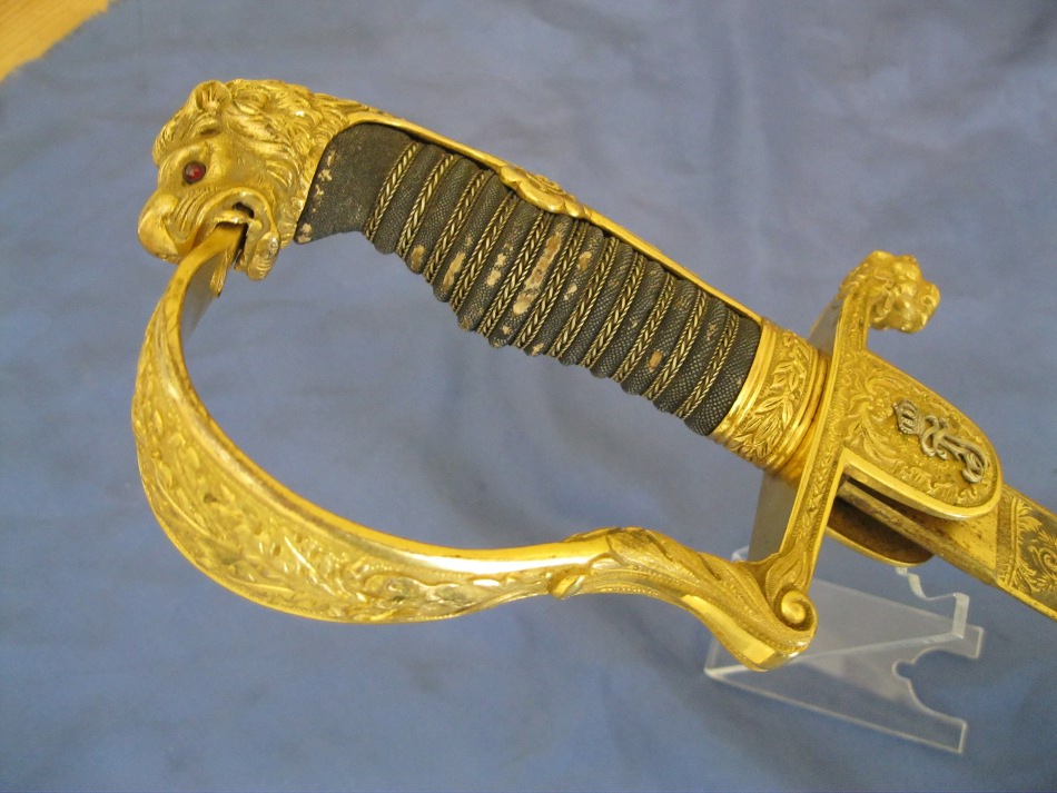 Der vorderseitige Parierlappen ist mit dem Chiffre des Großherzogs Friedrich Franz III. von Mecklenburg versehen. Somit läßt sich das Stück zumindest grob zuordnen.