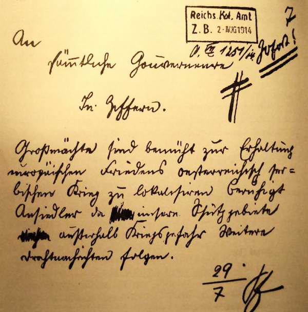 Sowie ein Telegramm des Staatssekretärs des Reichskolonialamtes Dr. Solf zu Beginn des 1. Weltkrieges vom 2.8.1914 an die Kolonialverwaltungen.