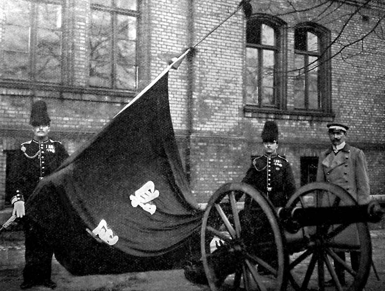 Verteidigung der deutschen Gesandtschaft in Peking eroberten Fahne aus der Kaserne des Seebataillons in das Marinemuseum in Kiel stattgefunden ... Unser Bild zeigt links den Unteroffizier