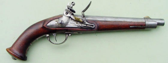 7“ auf allen Schraubenköpfen. Kein Truppenteilstempel. Staatliche Abnahmemarke „W“ am Schaft links, rechts neben der hinteren Schlossschraube. Nußbaumschaft mit typisch württembergischem Kolbenwulst und mit Eisenbeschlägen; diese bestehend aus Laufring mit rechtsseitiger Federarretierung und aufgelötetem Messingkorn, eingehaktem, vorne verschraubtem Abzugsbügel, unterem Kolbenbügel mit zwei Fingerwülsten, flacher, ovaler Kolbenkappe und s-förmigem Schlossgegenblech. Runder, am Pulversack seitlich abgeflachter Lauf. Schwanzschraubenblatt rund endend mit eingefeilter Kimme. Steinschloss mit links vom Hahn gerundetem, sonst flachem Schloßblech, hinter der Pfanne die eiserne „Stülpe“ als Auffanglager für den Hahn. Württembergischer, massiver Hahn mit ovalem Durchbruch. Gegossene Messingpfanne. Abzug mit im Schaftholz Abzugsschraube. Keine Ladestocknut. Hervorragende Schlossfunktion. Pistole im hundertprozentigen Originalzustand mit nur minimalen Alters- und Gebrauchsspuren.