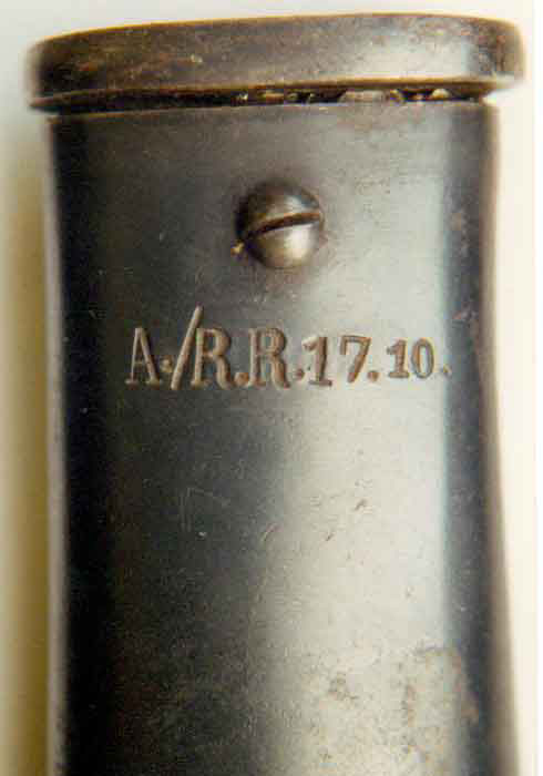 Die Scheide ist nicht dazu gehörig. Abweichendes Band mit einem starren Ring, nicht brüniert und auch das falsche Mundstück. Bei letzteren ist vermutlich die Rundung für den Steckrücken nachgearbeitet worden.