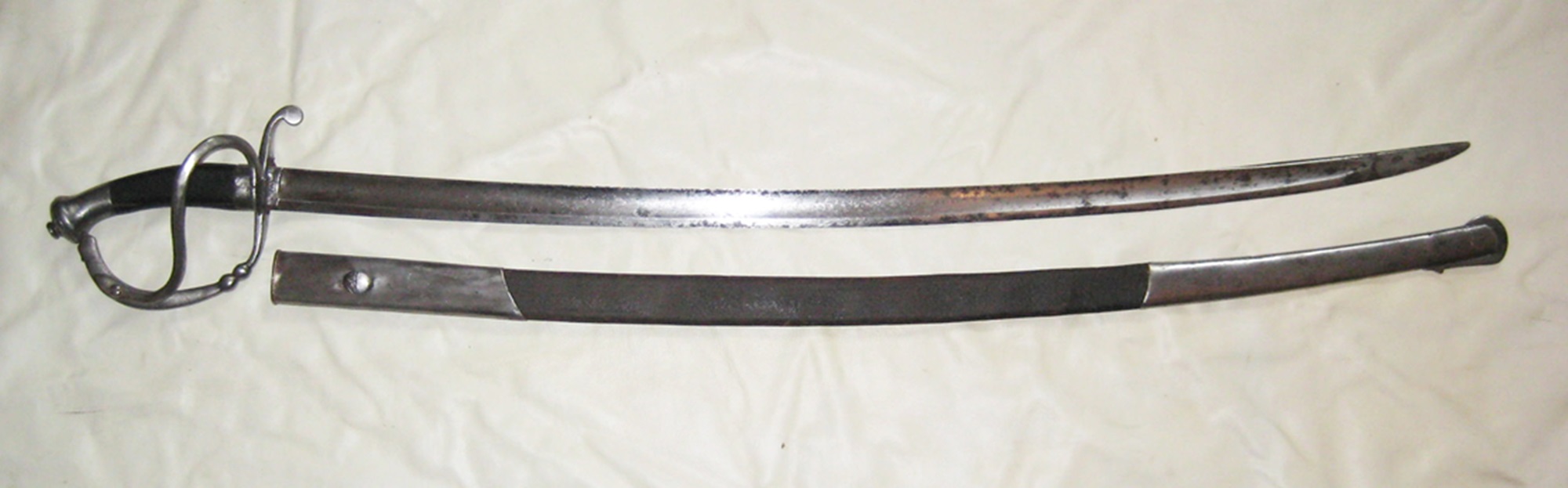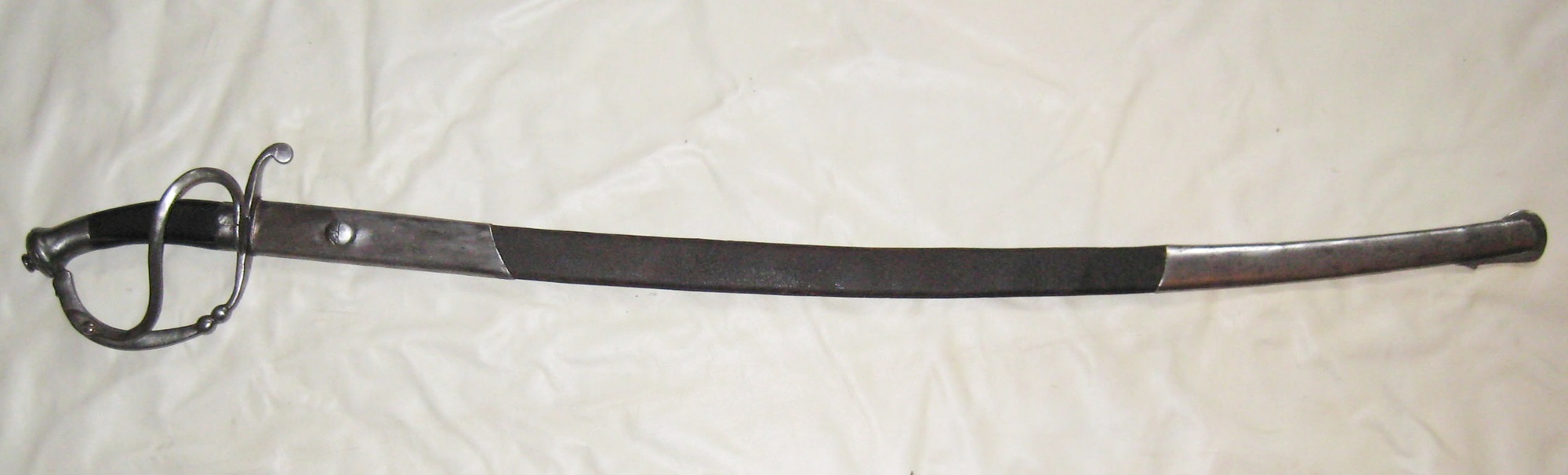 Geschwärzte Lederscheide mit eisernen Beschlägen. Zusätzlich zum Trageknopf eine Öse zur Aufname eines Tragerings