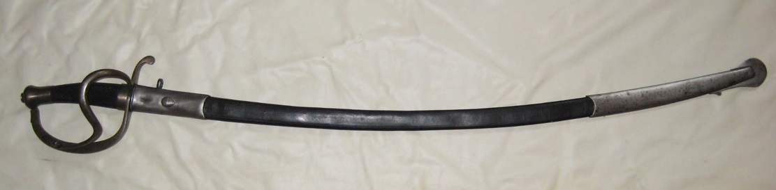 Geschwärzte Lederscheide mit eisernen Beschlägen. Zusätzlich zum Trageknopf eine Öse zur Aufname eines Tragerings