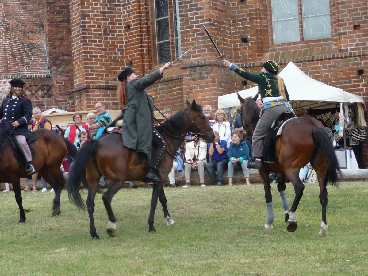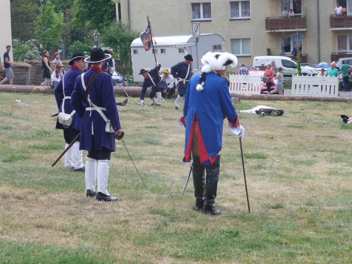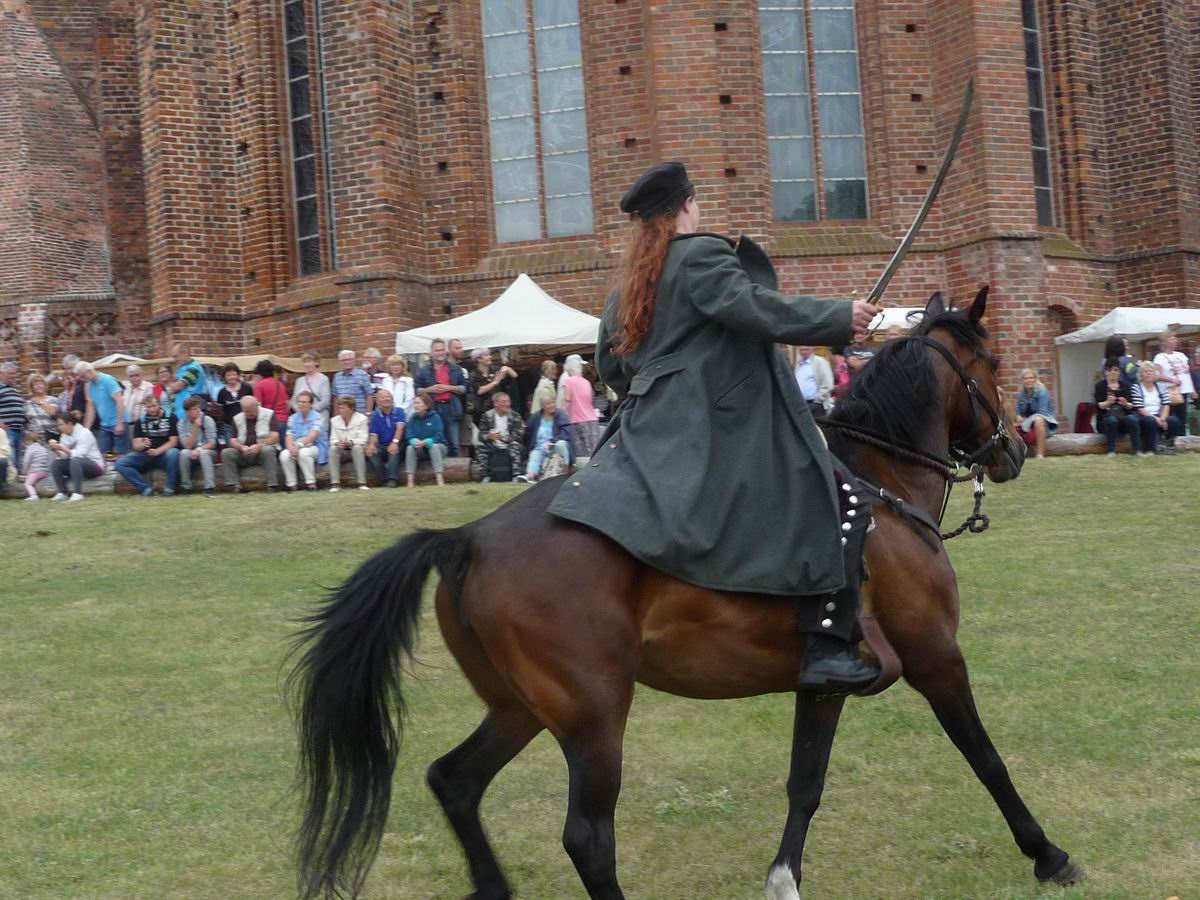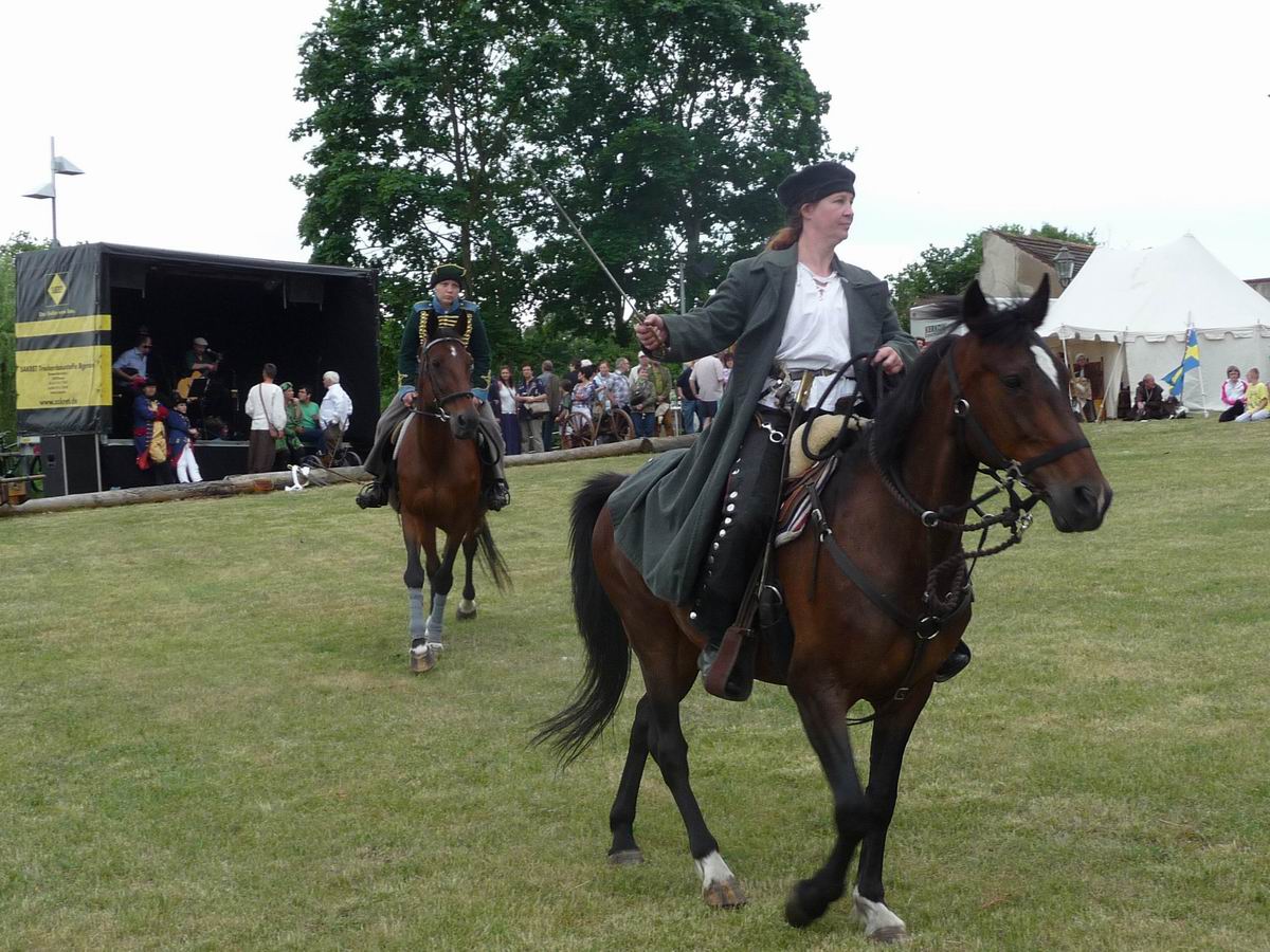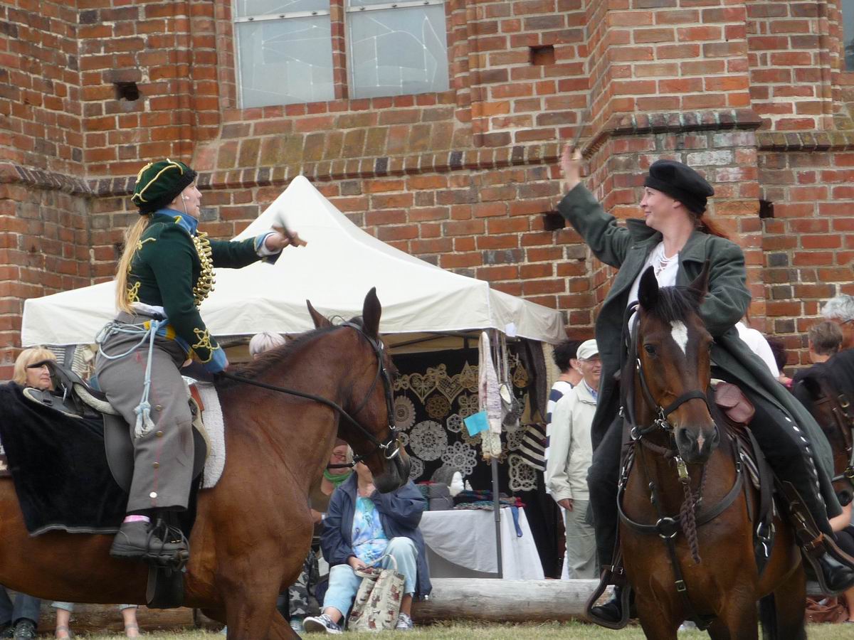 Die "Dragoner" auf den nachfolgenden Fotos zeigten so einige flotte Kampfszenen. Die historisch zum Anlass nicht passende Bekleidung und Bewaffnung hatte aber ein überraschendes Detail. Der Säbel einer der Damen war ein originaler. Leider habe ich keine detailreichen Fotos machen können, aber gesehen habe ich einen Säbel mit französischen Elementen um 1800 +/-. Die Klinge altersgemäß gedunkelt mit Trophäen und Ranken. Die Scheide war aus Leder und wurde zuerst Ende der Schlacht vermisst, dann aber doch wieder gefunden.
