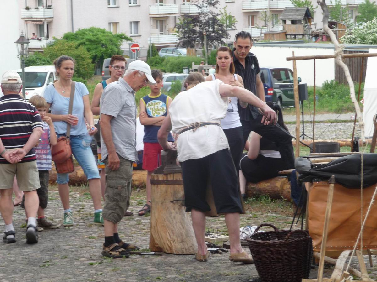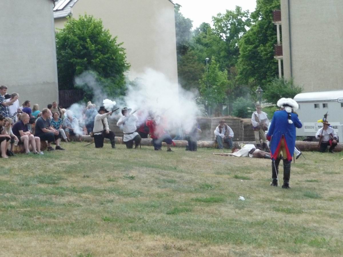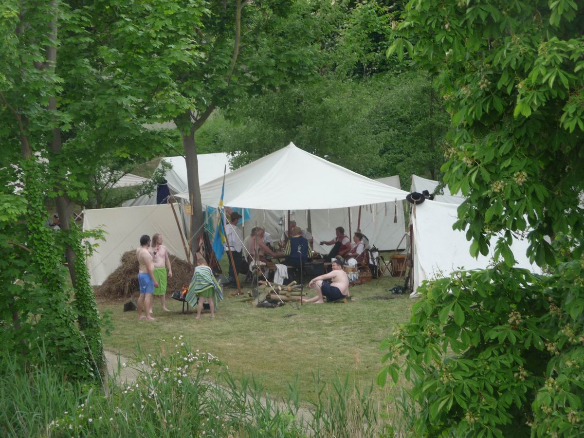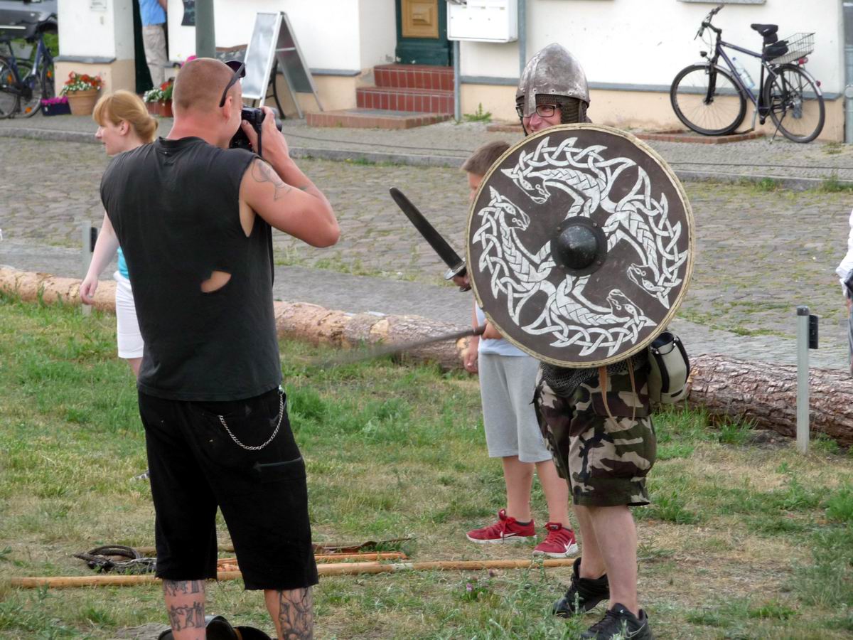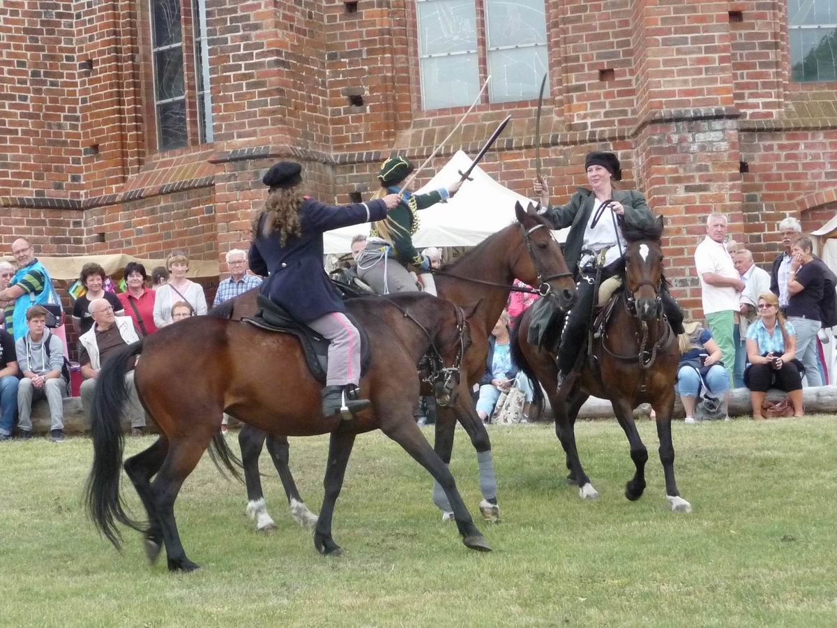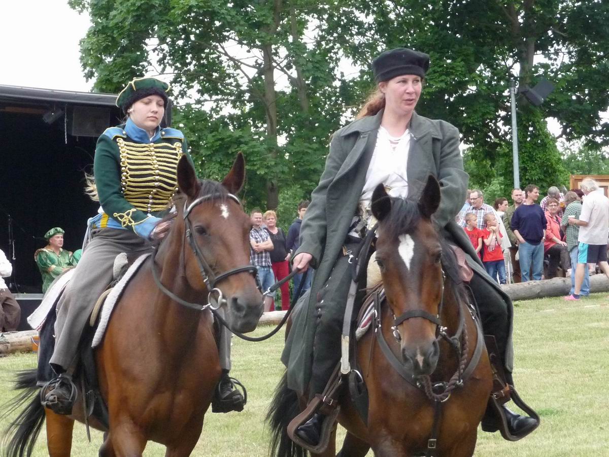 Die "Dragoner" auf den nachfolgenden Fotos zeigten so einige flotte Kampfszenen. Die historisch zum Anlass nicht passende Bekleidung und Bewaffnung hatte aber ein überraschendes Detail. Der Säbel einer der Damen war ein originaler. Leider habe ich keine detailreichen Fotos machen können, aber gesehen habe ich einen Säbel mit französischen Elementen um 1800 +/-. Die Klinge altersgemäß gedunkelt mit Trophäen und Ranken. Die Scheide war aus Leder und wurde zuerst Ende der Schlacht vermisst, dann aber doch wieder gefunden.