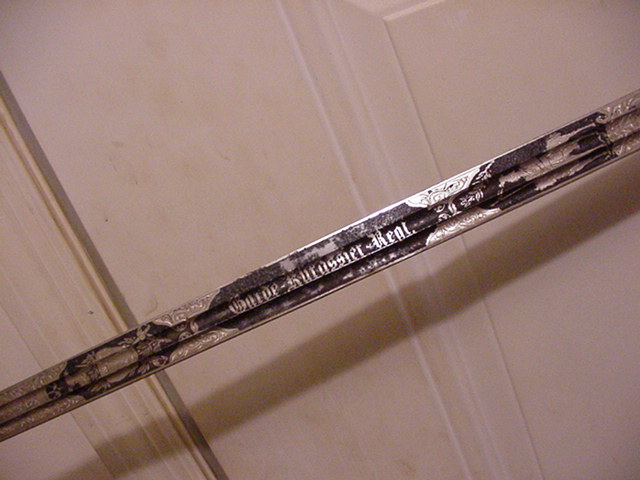 Handelsstempln; WK&C. Griff aus Fischhaut, mit silbernes Draht. Extra Modell, mit Fingerschlaufen,Klinge vernickellt, mit Regiments Aetzung dabei.