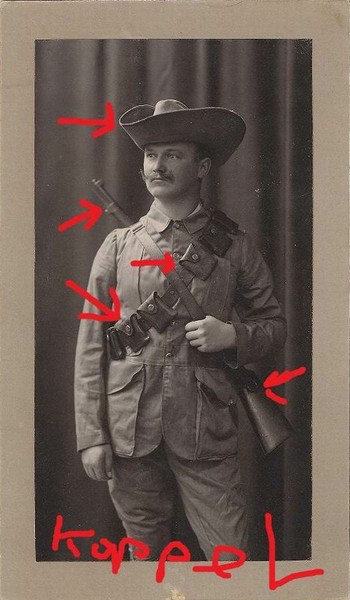 hab hier eine CDV Foto eines Soldaten mit unbek Schutztruppen Uniform, unbek. Karabiner bzw Patronengurt. Der Hut ist auf der falschen Seite hochgesteckt?!?