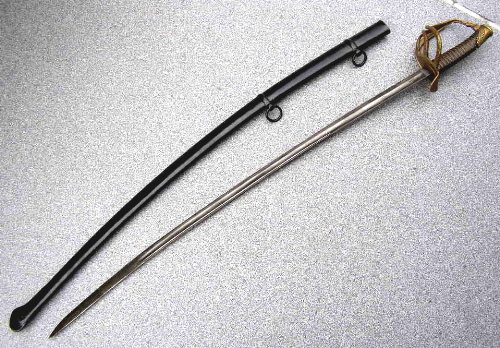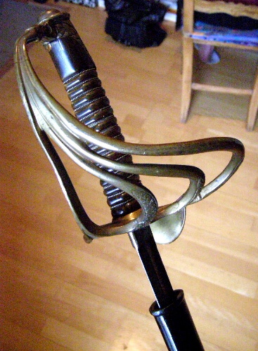 Bitte um Hilfe bei Bestimmung eines schweren Säbels, meiner Meinung nach ein sehr großes, massives Stück, daher wohl Kavallerie, verziert, daher wohl Offizier: Leicht gekrümmte Klinge mit breiter Hohlkehle. Solides, vierspangiges Messinggefäß. Dunkler Massivholzgriff mit Drahtwicklung. Keine Bezeichnungen oder Abnahmen zu sehen. Stabile, schwarz lackierte Eisenscheide , 2 Trageringe. Sehr großer, massiver Säbel, wie er nur bei der Kavallerie vom Pferd aus genutzt werden konnte, viel zu groß und lang als Infanteriewaffe. Die Maße: Gesamtlänge Waffe ca. 107 cm , Klingenlänge:ca. 89 cm, Klingenbreite: ca. 2,6cm, Klingenstärke: ca 7,5mm.- Vielleicht gehört die Scheide nicht dazu, da sie stärker gealtert ist und schlichter gefertigt. Passt aber genau.