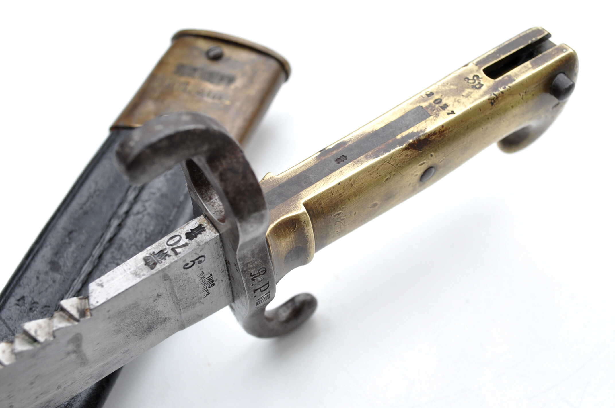 'Sp' darunter Stücknummer 2027 auf dem Griffrücken und ein Revisorstempel auf der Angel