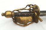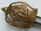 Preuß. Kürassierdegen (Mannschaft, sog. „M. 1732“, also frühe Adlerform mit kleiner Chiffre „FR“, Gefäß mit Kupfer zusammengelötet, Datierung zwischen 1740 und 42). Gefäß unten mit gravierter Nr. und drei Punkten (Montagemarkierung ?) versehen. Klinge bikonvex, ohne erkennbare Marken, mit Reißhaken, Länge 92, 7 cm.