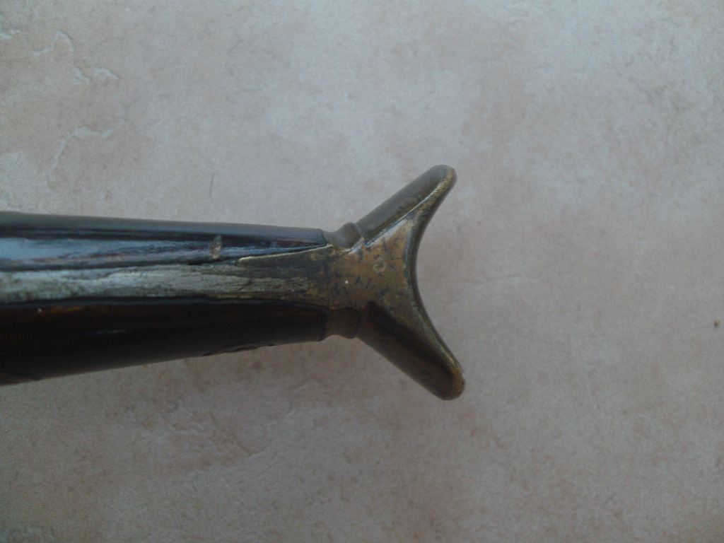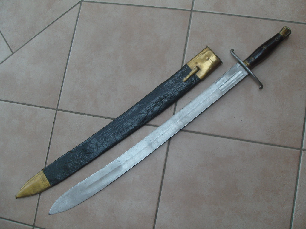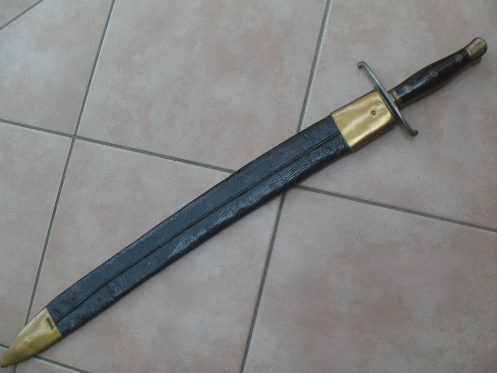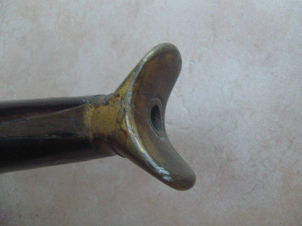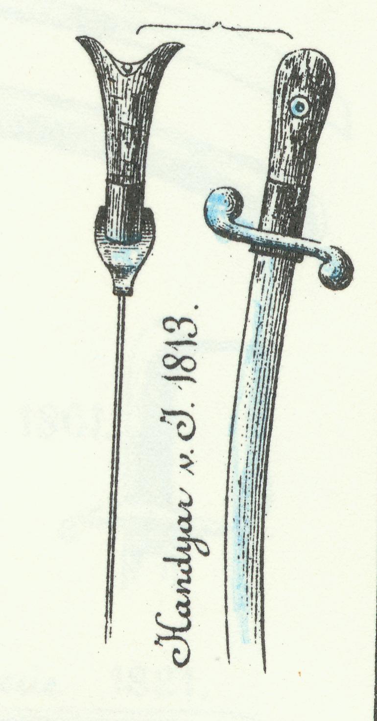 "Eine blanke Waffe muss jedoch wegen ihres ausgesprochen nationalen Aussehens besonders erwähnt werden; es ist der bei den Türken und süd-slavischen Völkern beliebte Handyar. Die Klinge desselben ist einschneidig convex-concav gestaltet; — der Griff hat keine Parierstangen, hingegen ver¬breitern sich die gewöhnlich hörnernen Griffschalen an ihrem obersten Theile zu einem mit einer Vertiefung ver¬sehenen Knaufe, welcher die meiste Ähnlichkeit mit dem Kopfe des Schenkel¬knochen eines größeren Wirbelthieres besitzt und wohl auch sich aus dieser Form entwickelt hat. Diese eigenthümliche Griffverstärkung — pomme d’oreille — genannt, dient zur Auflage des bei diesen Völkern üblichen langen Gewehres beim Schießen und wird der Handyar somit auch als eine Art Musketengabel angesehen."