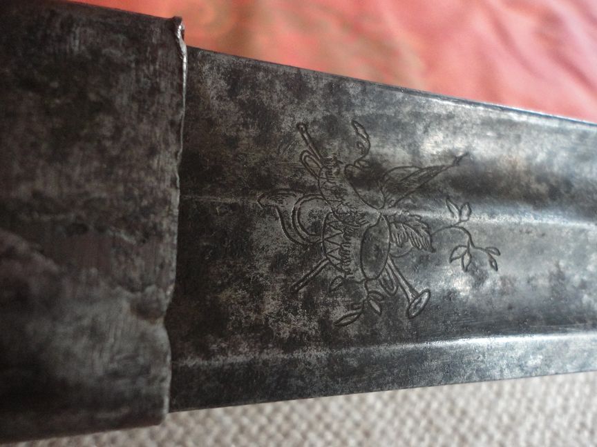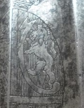 Die Radierung auf der Klinge ist das dänisch norwegische Wappen. Dies platziert den Pallasch in die Zeit vor der Teilung Dänemarks und Norwegen im Jahr 1814, als Resultat der Politik im napoleonischen Krieg.