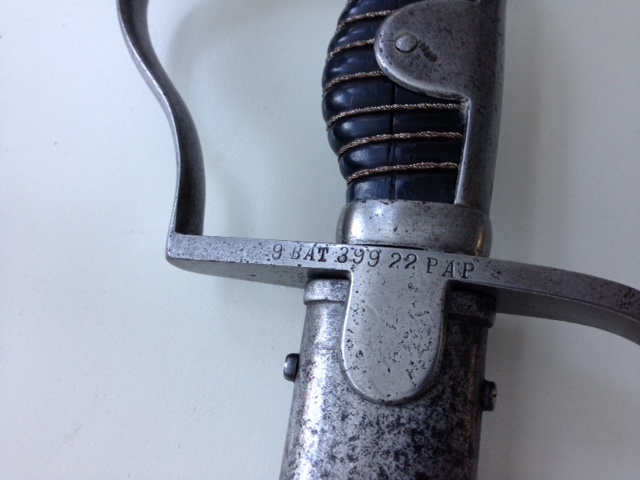 Auf den 'Blücher' steht 1.T.M.F.2.4 und 156 n1. Den Artilleriesäbel zeigt 9 BAT 399 22 PAP.