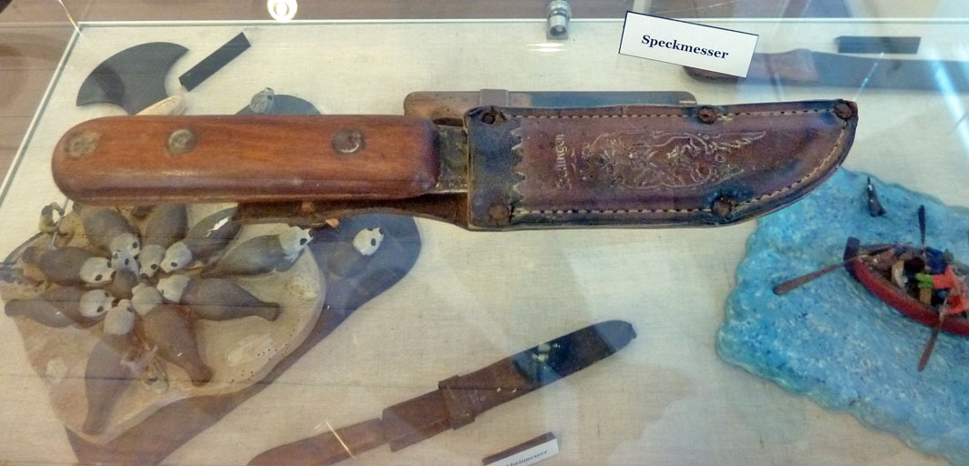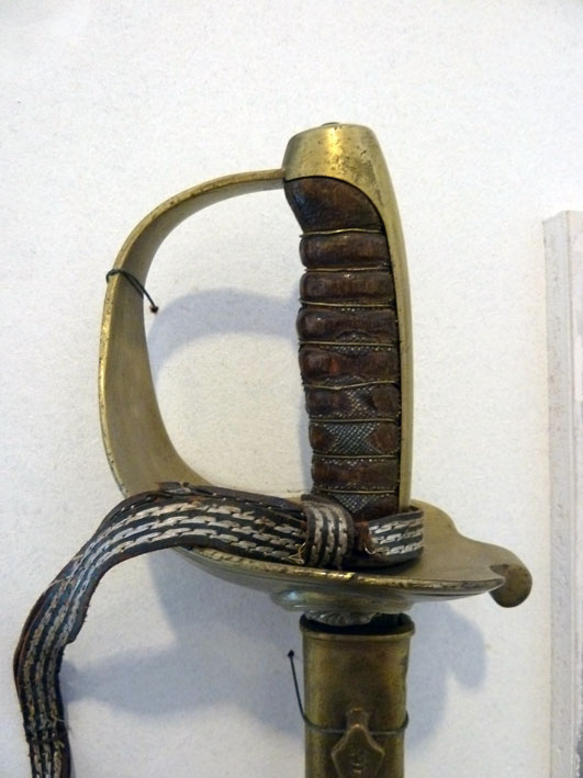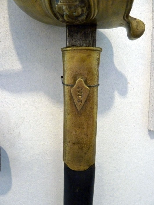 Das in der Ausstellung gezeigte Stück ist der dänische „Skibsabel M 1882“. Daß diese vom preußischen Muster für Polizei-Wachtmeister und –Sergeanten abweichende Seitenwaffe in den Besitz der Stadt oder des Beamten gekommen ist, ist kaum anzunehmen oder von den politischen Rahmenbedingungen nachvollziehbar. Kriegsbeute während des 1. Weltkriegs – wie z. B. bei holländischen Waffen – scheidet durch die strikte Neutralität Dänemarks aus. Dies um so mehr, als das Modell dort bis in die 40er Jahre verwendet wurde – und zu diesem Zeitpunkt die Kommunalpolizei in Deutschland einheitlich bewaffnet war.