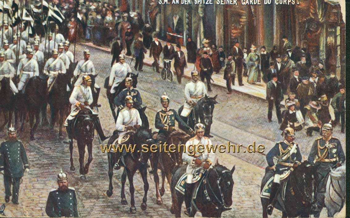 „S.M. der Kaiser besichtigt jedes Jahr im Frühjahr seine Garde du Corps und fürht das Regiment, umgeben von einer erlauchten Suite der Königlichen Prinzen und anwesende hohen Offizieren in die Kaserne zurück. „
