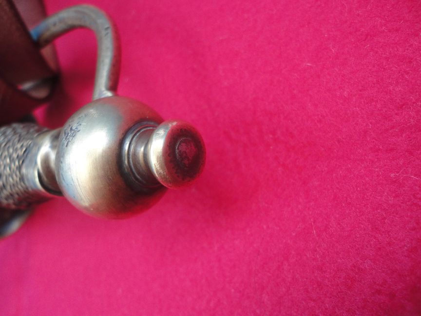 Er unterscheidet sich in der Griffhülse (nicht gegossen aus Messing sondern aus Holz mit noch teilweise umwickelten Messingdraht) und in der Klingenlänge ca.667mm, die doch für eine gekürzte Klinge sehr lang ist.(Klingen beim Infanterie-Säbel wurden auf 540-580mm gekürzt)