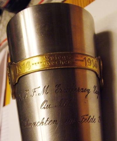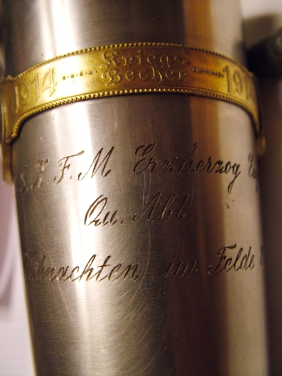 mein schwedischer Freund besitzt diesen Kriegsbecher. Kann ihm vielleicht jemand beim Entziffern der Buchstaben und der Abteilung helfen? Die Buchstaben "H G. K. F. M" und die Abteilung? "Qu. Abt. oder Abl." Vielen Dank für Eure Hilfe!