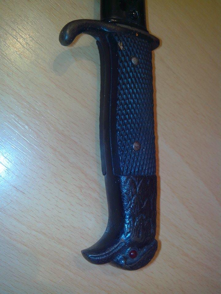 der Schaft ist ein Adlerkopf mit rote Augen das Bajonett