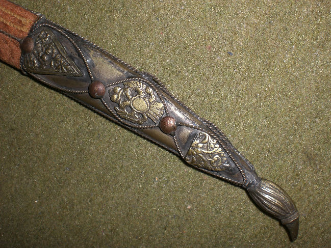 aus Messing, in der Mitte mit rötlichem Leder bezogen. Der Griff mit Parierstange