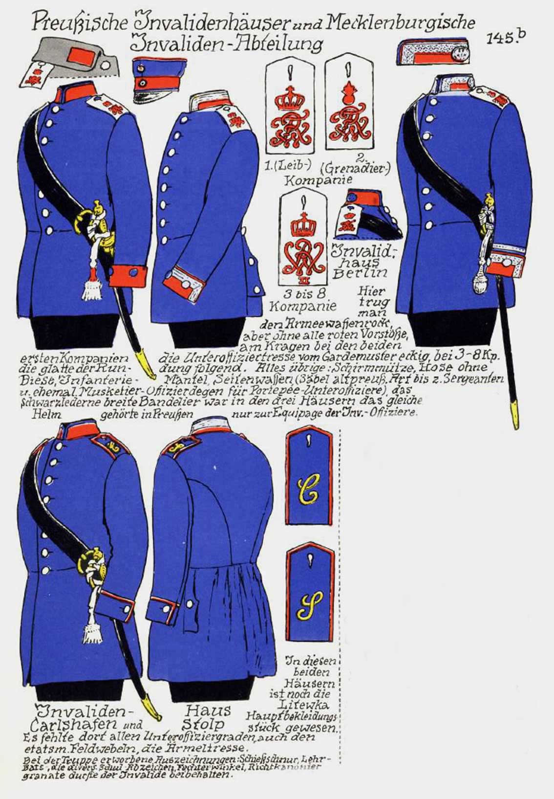 1748 wurde das Berliner Invalidencorps zu 3 Kompanien gegründet, 1846 Invalidenhaus zu Berlin mit 8 Kompanien.
