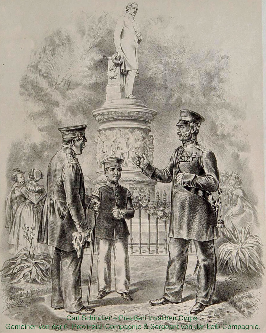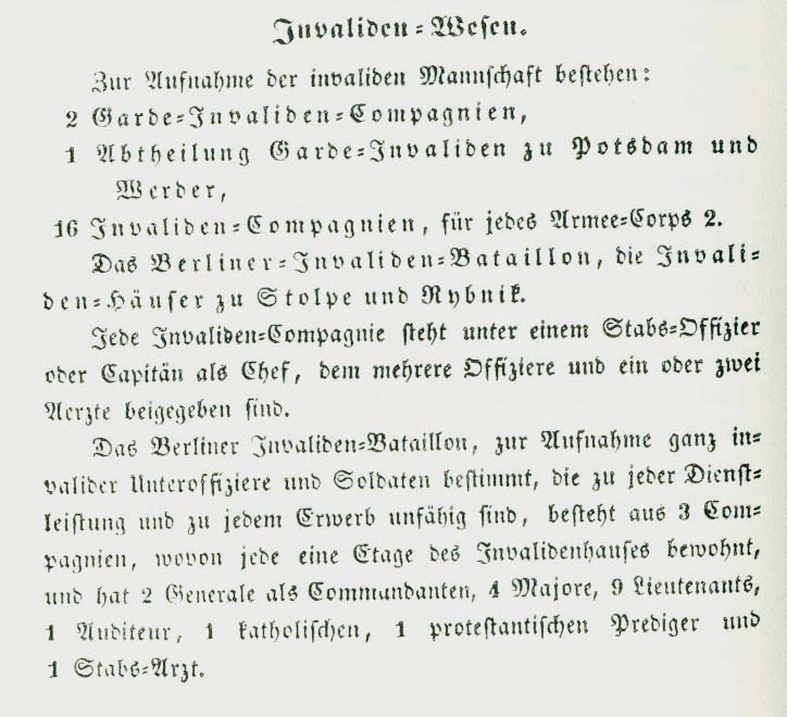 1748 wurde das Berliner Invalidencorps zu 3 Kompanien gegründet, 1846 Invalidenhaus zu Berlin mit 8 Kompanien.