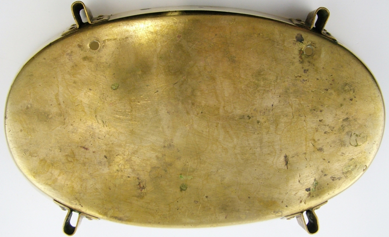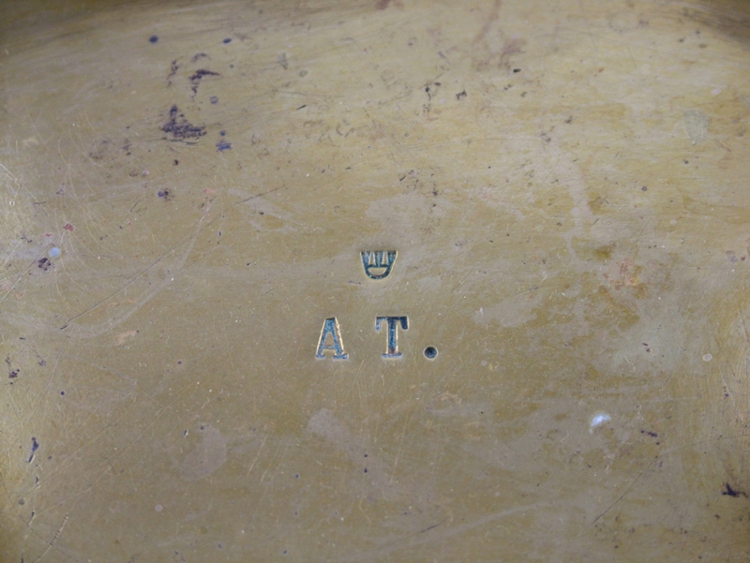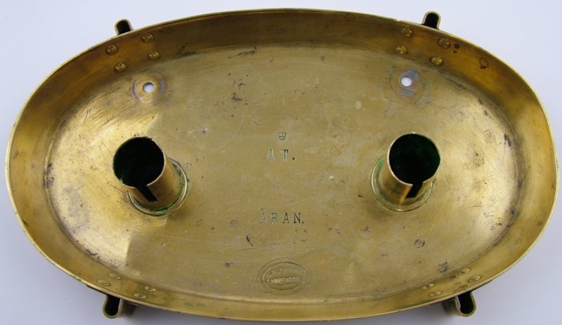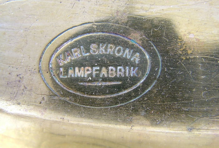 Die "Katzenpfote" ist das Zeichen der schwedischen Marine. AT. ist ein Abnahmestempel. Hergestellt wurde der Leuchter in der Lampenfabrik Karlskrona.