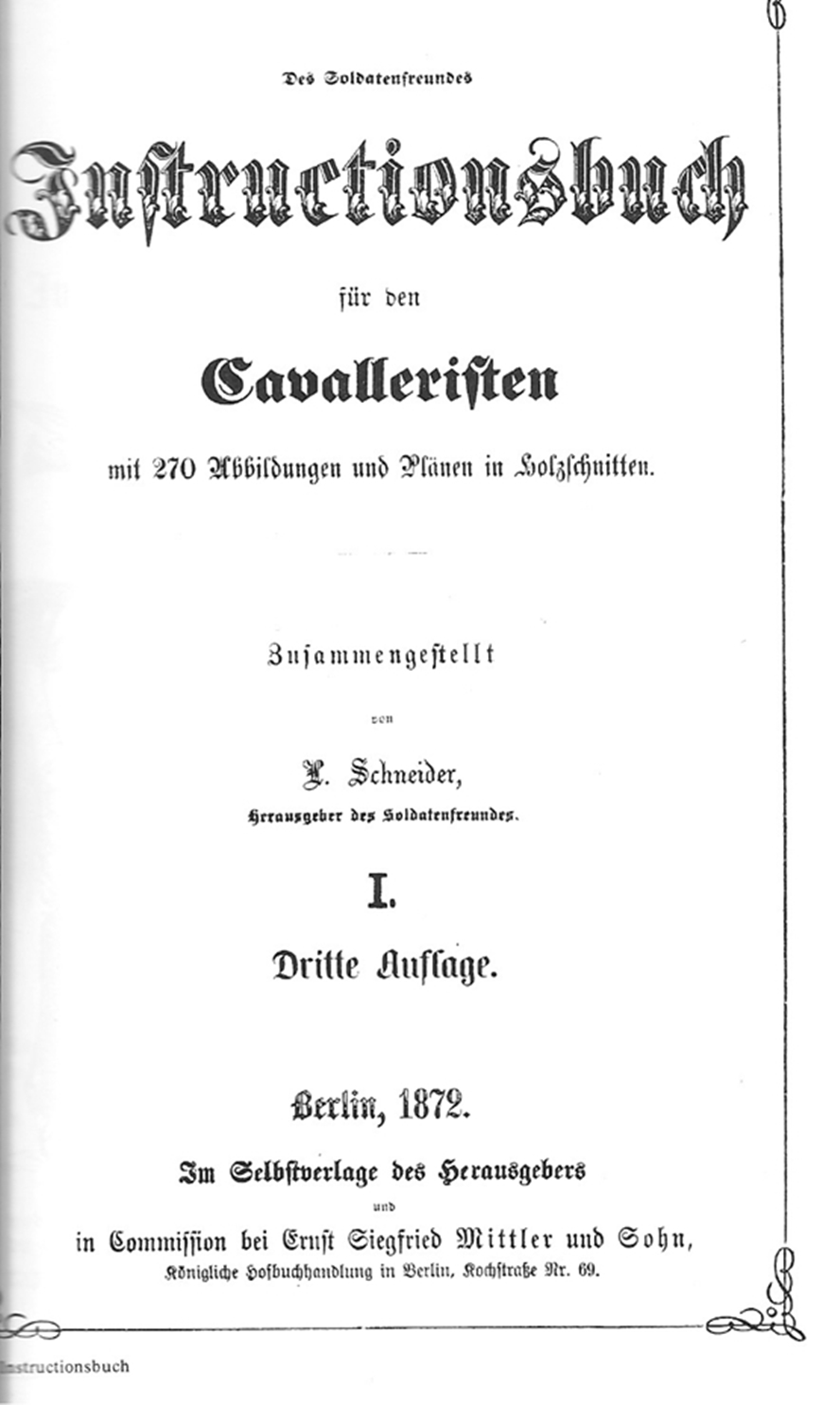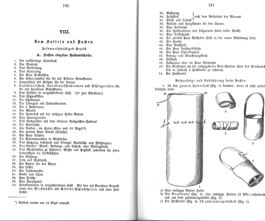 Die vorschriftsmäßige Trageweise des Säbels am Sattel wurde auch nicht in allen deutschen Staaten zur gleichen Zeit eingeführt. So z.B. wurde bereits ab 1849 in Württemberg der Säbel zum Dienst am Sattel befestigt. In anderen Staaten wie z.B. Preussen geschah dies vermutlich erst später. Hierzu auf Bild 1,2,3 ein Auszug aus dem „Instructionsbuch für den Cavalleristen“ von 1872. Dies war im Wesentlichen eine kurze Zusammenfassung der Dienstvorschriften, ähnlich dem heutigen „Reibert“ bei der BW. In diesem Buch wird ausführlich beschrieben, was, wie gepackt und am Sattel befestigt wird. Jedoch ist von einer Befestigung des Säbels noch keine Rede. Ich denke, dass hier eine zeitliche Zuordnung mit dem Entfernen des unteren Trageringes an der Waffe und dem weglassen zweiten Säbelschleppers in Zusammenhang gebracht werden darf.