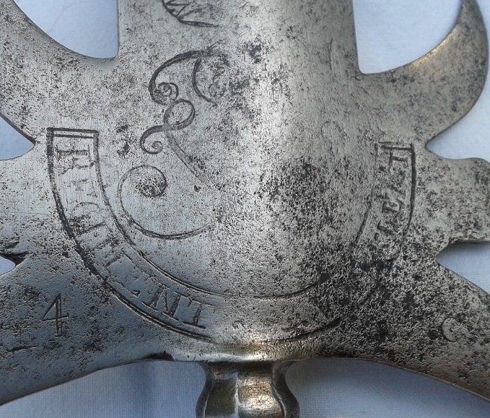 Anhand der verstärkten Spitze, der schlichten FWR-Chiffre, dem halbogenförmig durchhängenden Band und natürlich der eingeätzten Bezeichnung “REGIMENT VON. KLEIST“ gehörte es ab 1730 (bis 1749; Henning Alexander v. Kleist; Garnison Berlin) zum Bestand des berühmten Infanterie-Regiments Nr. 26, einem der anerkannt besten der preußischen Armee. Eingraviert wurden die zusätzlichen Bezeichnungen „4 C“ (4. Kompanie) und „ No 3“ (Waffe Nr. 3).