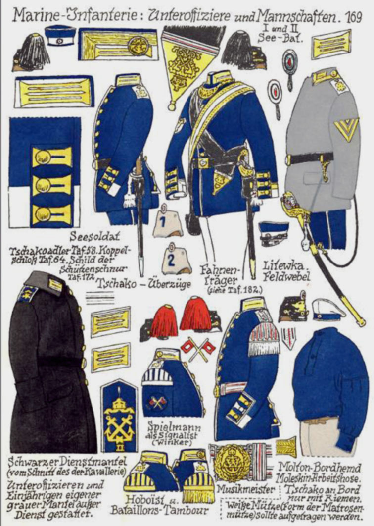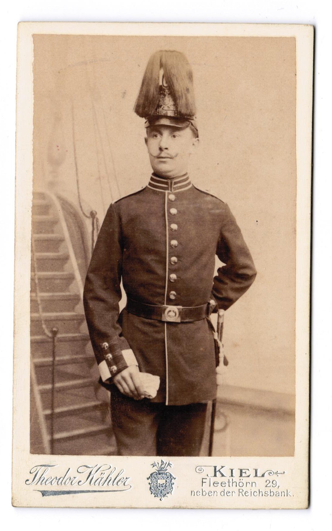 Es dürfte sich bei dem Soldaten um einen Seesoldat aus dem I. Seebataillon in Kiel handeln. Zeitlich läßt sich das Bild grob als vor 1900 bestimmen, da hier noch nicht das 98er Seitengewehr geführt wurde.