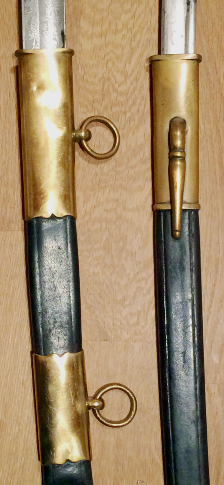 Wie man unschwer erkennen kann, stimmen die Kanten der Scheidenbeschläge nicht überein. Das Mundblech mit seitlicher Trageöse und Tragering. Der Tragehaken wurde vermutlich zugunsten der schleppenden Trageweise entfernt. Deutlich erkennbar ist die ursprüngliche Form auch an der unteren Randverstärkung.
