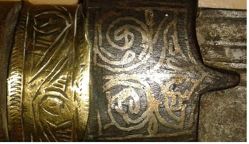 Zum Säbel: Die Hilze (der Griff) ist aus Horn. Die Parierstange scheint inkrustiert zu sein. Kann die Farbe der Verzierung aber nicht deuten. Ist es Silber- oder Goldfarbig?