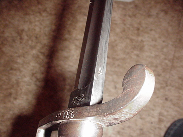 WK&Co, Keine Stempln ausserhalb, "Krone/RC" am ruecken der Felhscharfe, und "Krone/A" am endestueck der Scheide..
