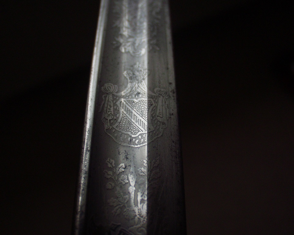 Durch die sorgfältige heraldische Ausführung erscheint ein Irrtum eher unwahrscheinlich. Ebenso, daß auf einer sächsischen Klinge das badische Wappen aufgebracht wurde. Man erwartet auch keinen Mercedes-Stern auf einem VW.