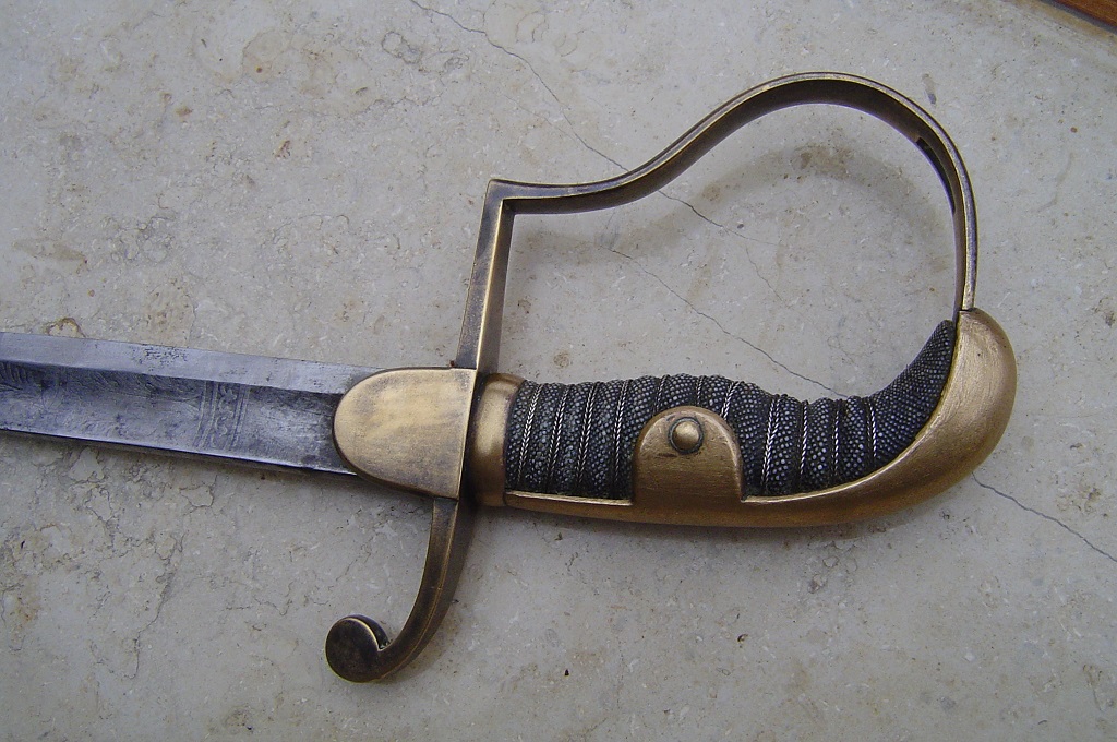 Sehr ungewöhnlich ist die Form, bzw. die Art der beiden Parierstangenlappen. Sie ist mir bisher so nur an einem Säbel begegnet, der eindeutig der leichten Infanterie des Königreichs Hannover zuzuordnen ist