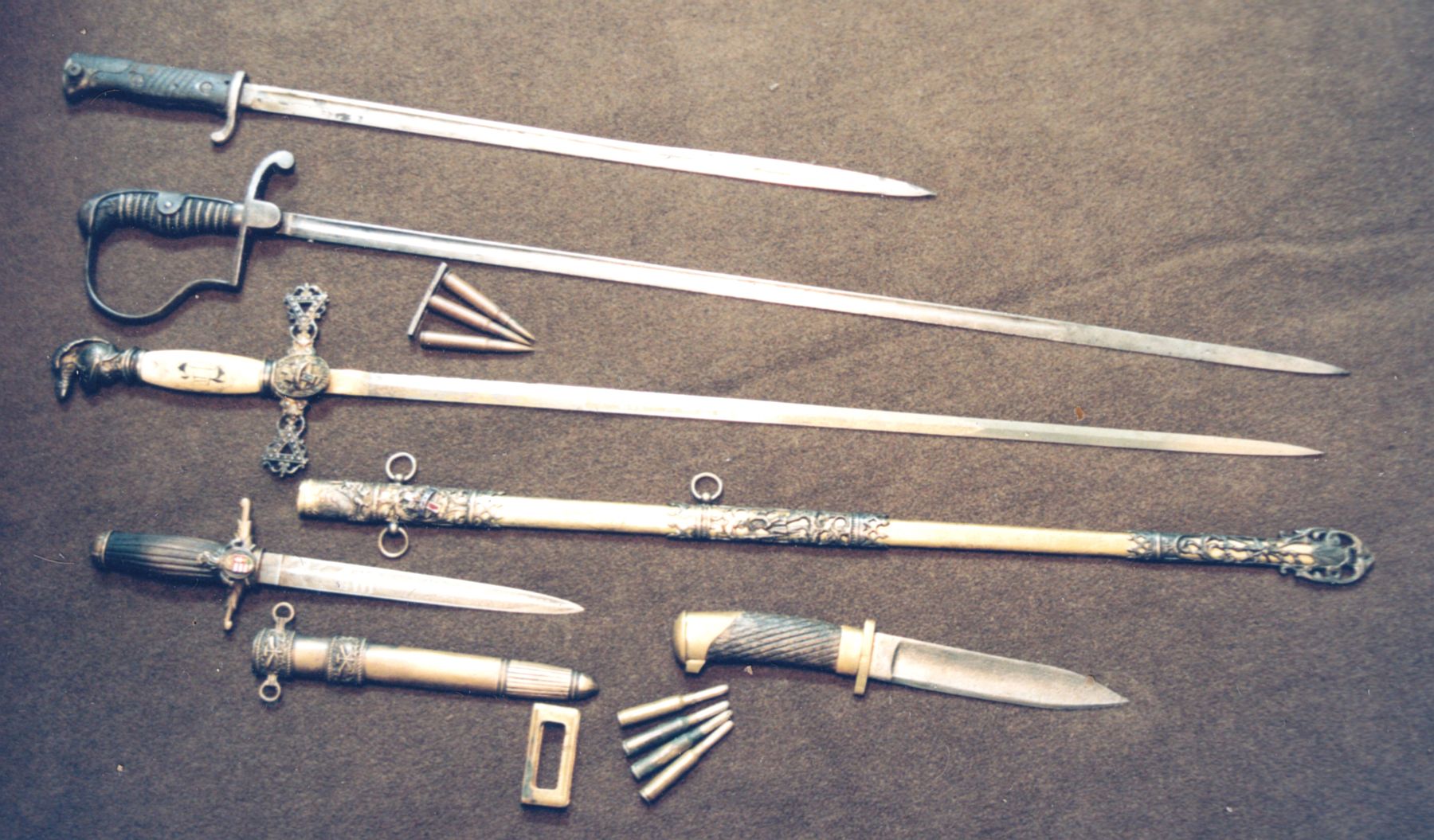 Ein paar Sachen aus den Anfängen, oben - ein privates SG98nA, darunter ein Degen mit Füsiliergefäß (auf der Fehlschärfe geätzt: G.Seifert, koniglicher Guldentrakker Kopenhagen oder so ähnlich), dann ein Freimauerdegen mit Beingriff und vergoldeter Messingscheide, Händler aus San Francisco, Besitzer "T.McDonald Devin", dann ein ungarischer Feuerwehrdolch aus den späten 20igern, zuletzt ein zum Grabendolch umgearbeiter russ.Säbel.